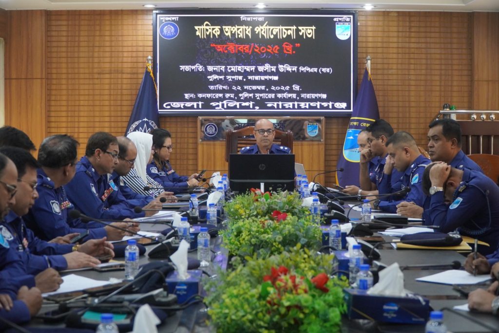 এস এম জহিরুল ইসলাম বিদ্যুৎ :  আজ ২২ নভেম্বর ২০২৫ খ্রিঃ (শনিবার) বেলা ১১.০০ ঘটিকায় অক্টোবর/২০২৫ মাসের বিভিন্ন মামলার অগ্রগতি বিষয়ে “অপরাধ পর্যালোচনা সভা” অনুষ্ঠিত হয়। অতিরিক্ত পুলিশ সুপার (ক্রাইম এন্ড অপস্) তারেক আল মেহেদী পাওয়ার পয়েন্ট প্রেজেন্টেশনের মাধ্যমে অক্টোবর/২৫ মাসের বিভিন্ন মামলার অগ্রগতি প্রতিবেদন এবং অপরাধ নিয়ন্ত্রণে করণীয় বিষয়ে উপস্থাপন করেন। নারায়ণগঞ্জ জেলার সুযোগ্য পুলিশ সুপার মোহাম্মদ জসীম উদ্দিন, পিপিএম (বার) তাঁর বক্তব্য অক্টোবর মাসে ডাকাতি ও দস্যুতার ঘটনা কম সংগঠিত হওয়ায় অফিসার ইনচার্জদের ধন্যবাদ জ্ঞাপন করেন। চুরি, ছিনতাই, দস্যুতা এবং ডাকাতির ঘটনা যাতে না ঘটে সেজন্য তিনি রাত্রি বেলায় পুলিশের টহল জোরদার এবং হাইওয়েগুলোতে হাইওয়ে পুলিশের সাথে সমন্বয় রেখে ক্রস পেট্রোলিং করার জন্য নির্দেশ প্রদান করেন। আসন্ন জাতীয় সংসদ নির্বাচনকে কেন্দ্র করে প্রাথমিকভাবে মনোনয়নপ্রাপ্ত প্রার্থী এবং বঞ্চিত নেতৃবৃন্দের বিভিন্ন প্রোগ্রামে নিরপেক্ষ ও পেশাদারিত্বের সাথে দায়িত্ব পালন করার জন্য তিনি নির্দেশ প্রদান করেন। পুলিশ সুপার আরও বলেন, “সিদ্ধিরগঞ্জ থানা, আড়াইহাজার থানা এবং পুলিশ লাইন্স থেকে লুট হওয়া অস্ত্র-গোলাবারুদ উদ্ধারের জন্য গোয়েন্দা তথ্যের ভিত্তিতে বিশেষ অভিযান পরিচালনা করতে হবে।” ইতিমধ্যে লুন্ঠিত এসব অস্ত্র-গোলাবারুদ উদ্ধারে তথ্য প্রদানকারী ব্যক্তিকে পুরস্কৃত করা হবে মর্মে জেলা পুলিশের পক্ষ থেকে ঘোষণা করা হয়েছে।অতঃপর পুলিশ সুপার জেলার শ্রেষ্ঠ এএসআই হিসেবে আড়াইহাজার থানার এএসআই (নিঃ)/মামুনুর রশিদ, জেলার শ্রেষ্ঠ এসআই(নিঃ) হিসেবে রূপগঞ্জ থানার এসআই(নিঃ)/ জয়নাল আবেদীন, ক্লু লেস মামলা ডিটেকশনে বিশেষ দক্ষতার জন্য ফতুল্লা মডেল থানার এসআই(নিঃ)/মোঃ রফিক, বিপিএম; অর্পিত দায়িত্ব কৃতিত্বের সাথে সম্পাদনের জন্য সদর কোর্ট, নারায়ণগঞ্জ এএ কর্মরত ইন্সপেক্টর (নিঃ) মোঃ আব্দুল কাইয়ূম; গুরুত্বপূর্ণ মামলা সুষ্ঠুভাবে নিষ্পত্তি করার জন্য সদর মডেল থানায় কর্মরত ইন্সপেক্টর (নিঃ) মোঃ জামাল উদ্দিন; বাৎসরিক ফায়ারিং সুষ্ঠুভাবে সম্পন্ন করার জন্য এসআই (সঃ)/কাজল মিয়া সহ তার টিম; ১০ বছরের সাজা প্রাপ্ত ওয়ারেন্টভূক্ত আসামি গ্রেফতারের জন্য রূপগঞ্জ থানায় কর্মরত এএসআই (নিঃ)/মোঃ শাহারুল ইসলাম এবং সাহসিকতার সাথে কর্তব্য পালনের জন্য আড়াইহাজার থানার ড্রাইভার কং/১৬৩৯ মোঃ হাওলাদার লপ্তি-দের পুরস্কৃত করেন। এসময় জেলা পুলিশের অতিরিক্ত পুলিশ সুপারবৃন্দ, “গ” সার্কেল এর সহকারী পুলিশ সুপার, ইন্ডাস্ট্রিয়াল পুলিশ ও হাইওয়ে পুলিশের সহকারী পুলিশ সুপারবৃন্দ, সকল থানার অফিসার ইনচার্জ, সিআইডি, নৌপুলিশ ও টুরিস্ট পুলিশের পুলিশ পরিদর্শ